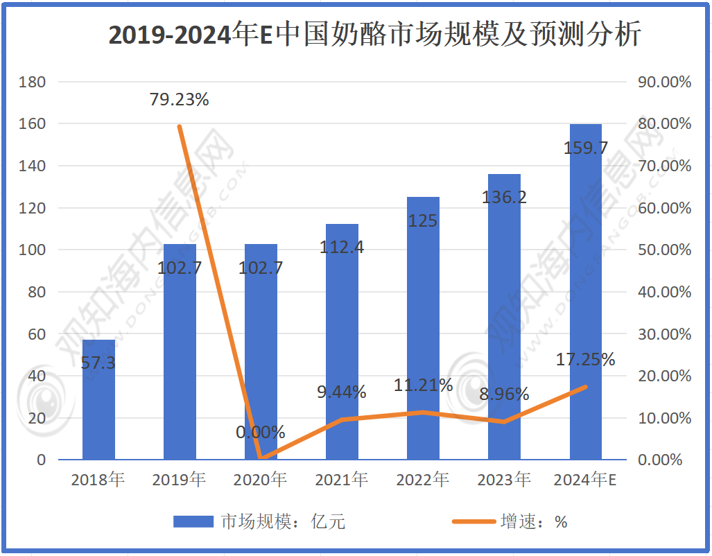 按照数据显示:2018年奶酪市场规模为57。3亿元,2020年连结正在102。7亿元,2021年为112。4亿元,2022年125亿元,2023年136。2亿元,2024年估计159。7亿元。全体来看,